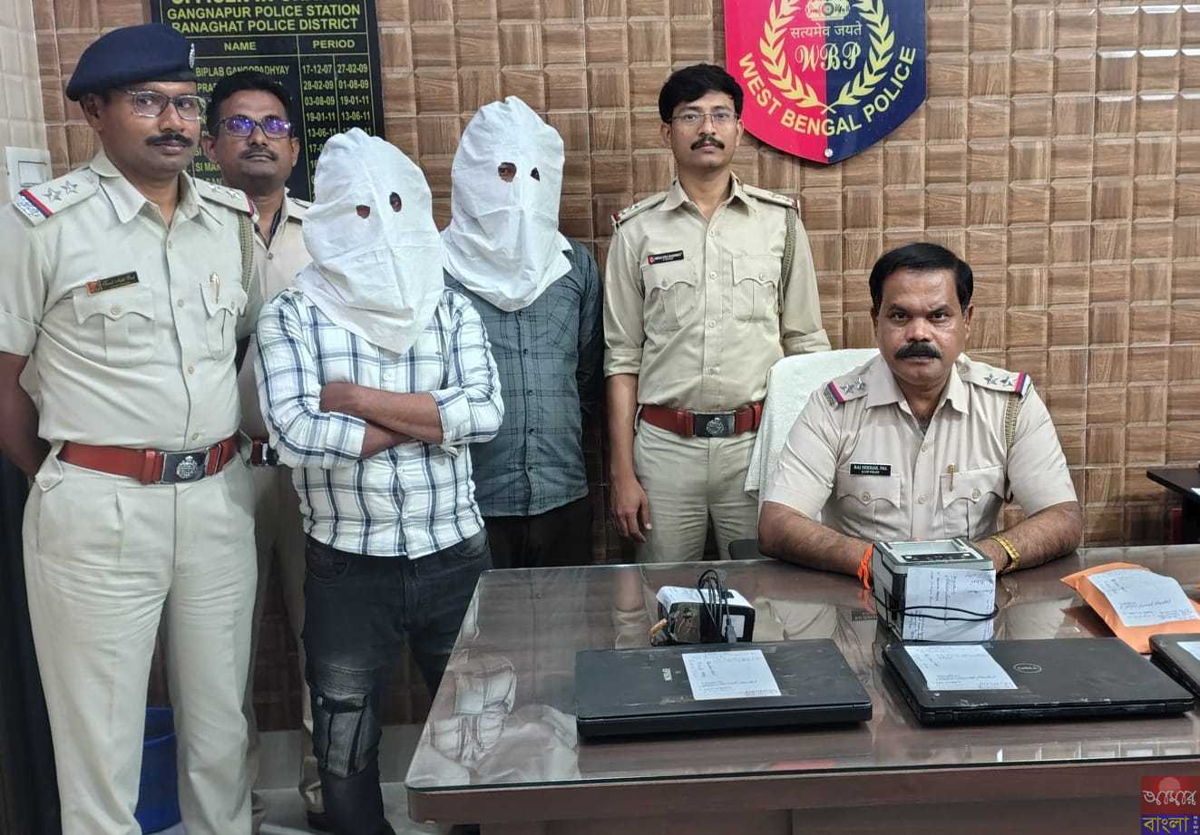 নদীয়ার গাংনাপুর থানা পুলিশ গোপন সূত্রে খবর পেয়ে দুইজনকে গ্রে*ফ*তার করে ওয়াসিম আকরাম মন্ডল ও আবদুস মন্ডল গাংনাপুর হাবিবপুর পি এম গ্রেফতার করে তাদের কাছ থেকে একটি দুটি ল্যাপটপ ও বিভিন্ন আধার কার্ড তৈরি করার সরঞ্জাম ও ফোন তাদের কাছ থেকে ফোন উদ্ধার করে গাংনাপুর থানা পুলিশ তাদেরকে গাংনাপুর থানা পুলিশ জিজ্ঞাসা করার পর থেকে জানা যায় তারা বিভিন্ন জাল আধার কার্ড তৈরি করতেন যারা বাংলাদেশ থেকে যারা এইখানে বসবাস করেন তাদের থেকে তাদের থেকে মোটা টাকার অংশ নিয়ে জাল-আধার কার্ড তৈরি করতেন এরকমই অভিযোগ অভিযোগের ভিত্তিতে পুলিশ দুইজনকে গ্রেফতার করে আজকে কিন্তু তাকে রানাঘাট জেলা আদালতে পাঠানো হলো তাদেরকে ৭ দিনের পুলিশ কাশিতে না হবে এরকম গাংনাপুর থানা পুলিশ সূত্রে খবর