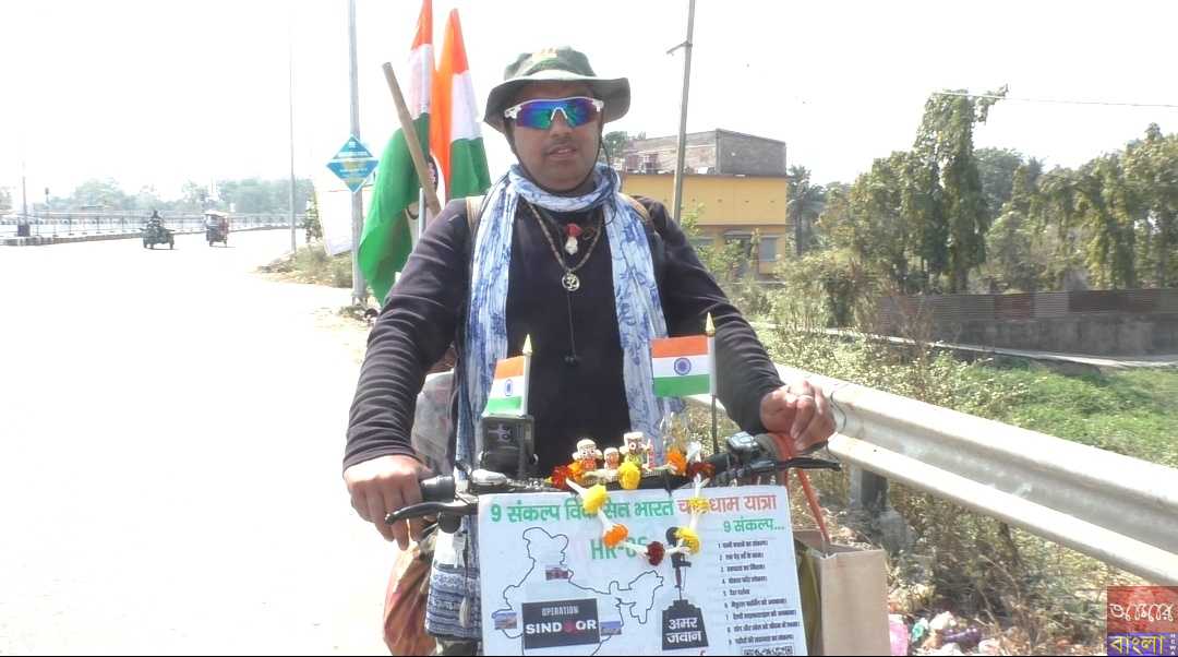 মনে অফুরন্ত ইচ্ছা সঙ্গে সাইকেল ও শয্যা নিয়ে বেরিয়ে পড়েছিল দীপক শর্মা 2025 এর মে মাসের ২৫ তারিখে হরিয়ানার পানিপথ থেকে। তিনি ঘুরতে ঘুরতে আপাতত এসে পৌঁছেছেন পশ্চিমবঙ্গের উত্তর ২৪ পরগনার ব্যারাকপুর শিল্পাঞ্চলে। তার একমাত্র সাথী সাইকেলে দিনরাত প্যাটেল করে চলেছেন। উদ্দেশ্য একটাই চারধাম দর্শন করা। তিনি পশ্চিমবঙ্গে পা দিয়েই সমস্ত পশ্চিমবঙ্গের দেশ নায়কদের প্রণাম ও সম্মান জানালেন শঙ্খ বাজিয়ে। তিনি সাইকেল নিয়ে রাস্তায় আজ ২৭০ দিন এবং ১০৮০০ কিলোমিটার সাইকেল চালিয়েছেন, এখনো ৫০০০ কিলোমিটার পথ যাবেন দীপক শর্মা। সাইকেলে দেশের জাতীয় পতাকার পাশাপাশি ৯টি সংকল্প নিয়ে বেরিয়েছে যেমন জল বাঁচান, একটা গাছ মায়ের সমান, গরিবদের সহায়তা করুন ইত্যাদি। তার ইচ্ছে ভারতে প্রথম যেখানে সূর্যোদয় হয় সেখানে গিয়ে সূর্য দেখে শঙ্খ বাজিয়ে স্বাগত জানাবেন। এবং তিনি দেশের প্রধানমন্ত্রী নরেন্দ্র মোদির যে ভাবনা বিকশিত ভারত তার সাথ দিতে বলেন। পাশাপাশি অপারেশন সিঁদুর নিয়েও অতি উৎসাহী তিনি। এক কথায় তার ইচ্ছেশক্তি একেবারেই অভাবনীয়। এভাবেই সাইকেল চালিয়ে ঘুরতে ঘুরতে তিনি আরো একটি জেলা আরো একটি রাজ্য পেরিয়ে তার লক্ষ্যে পৌঁছবেন এমনটাই কামনা করি আমরাও।